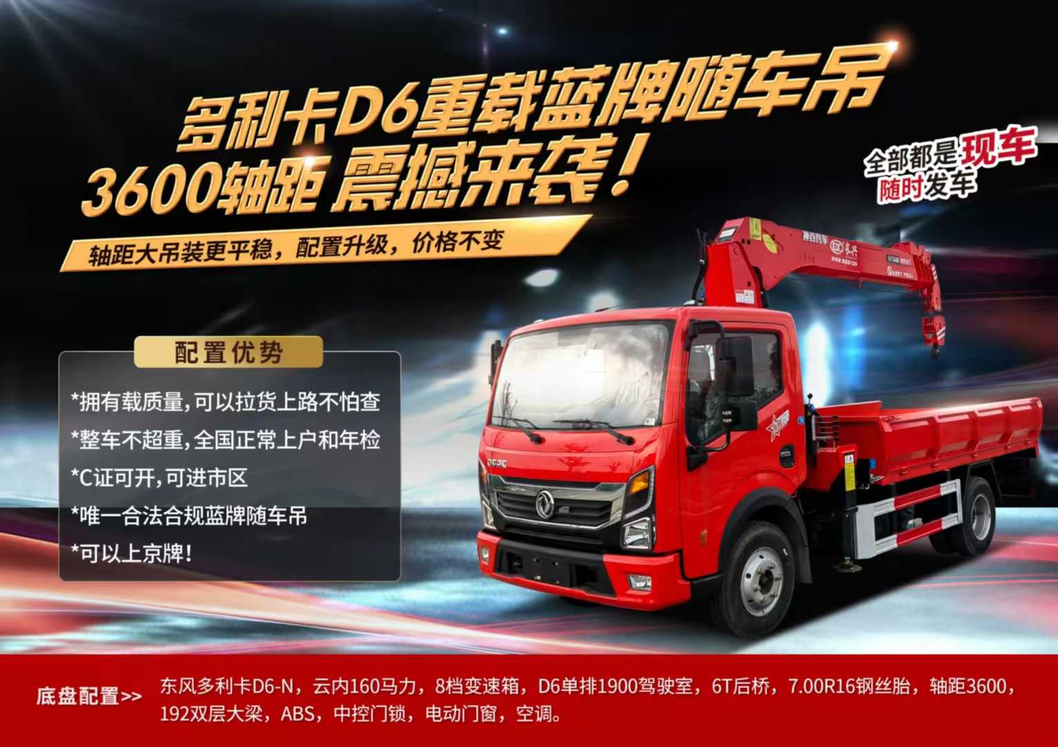 合法合規(guī)重載藍(lán)牌隨車吊特價(jià)來襲,3600軸距穩(wěn)如磐石,拉貨吊裝全能王,C證可開能進(jìn)市區(qū),能上京牌,拉貨不怕查,合法又合規(guī)!東風(fēng)多利卡D6重載版,8檔的變速度,6噸后橋,配置升級價(jià)格不變,現(xiàn)車隨時發(fā)車!